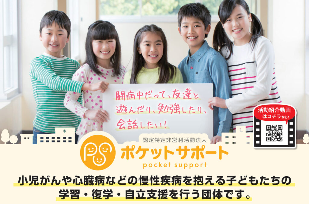 「認定NPO法人ポケットサポート」は、岡山市を拠点に、小児がんや心臓病などの慢性疾患で長期療養を続ける子どもたちをサポートする団体です。