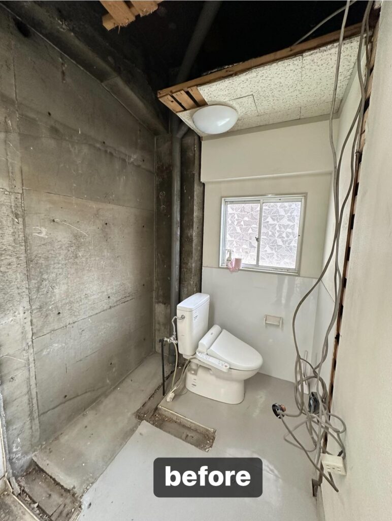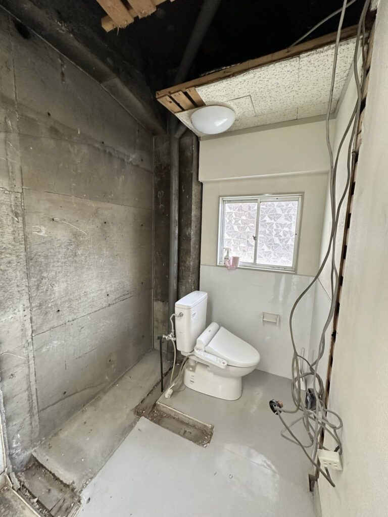 TOTO製シャワートイレやLIXILのパブリック手洗い器、防水パネルを設置し、動線の確保と快適性を両立させました。