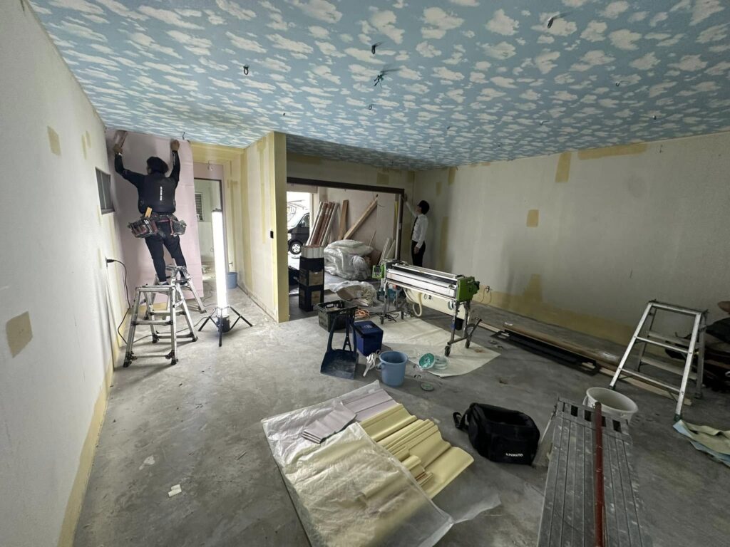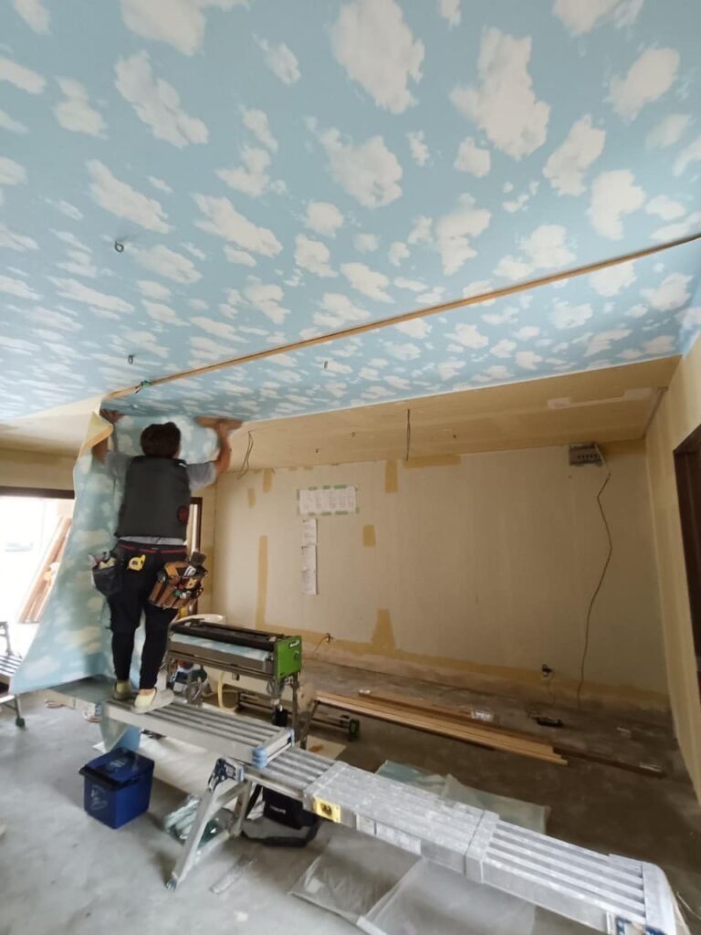 内装仕上げに入ると、天井や壁のクロス貼りが始まりました。