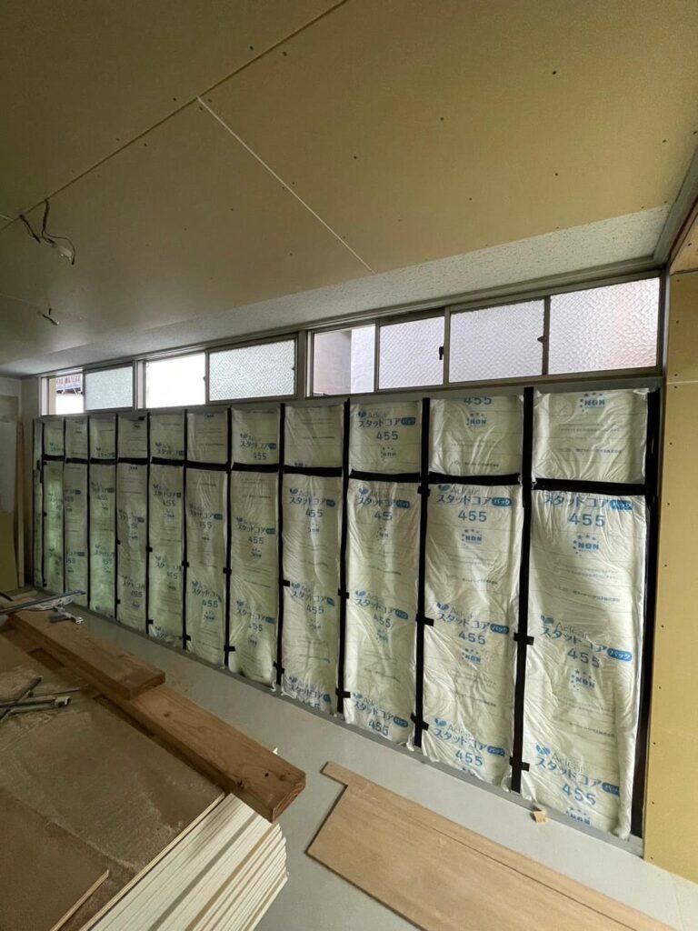 解体が終わると、軽量鉄骨材による間仕切りや外壁・内壁の造作が進められました。